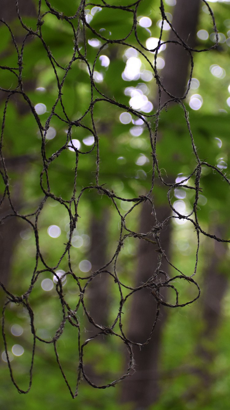 Suspended over a narrow path, the work blends almost seamlessly into the greenery of the trees and their countless branches. At first glance, it may seem to disappear, but if you look closely, you can see and even touch it. It moves in the wind, with light shining through, allowing it to communicate with its natural surroundings.