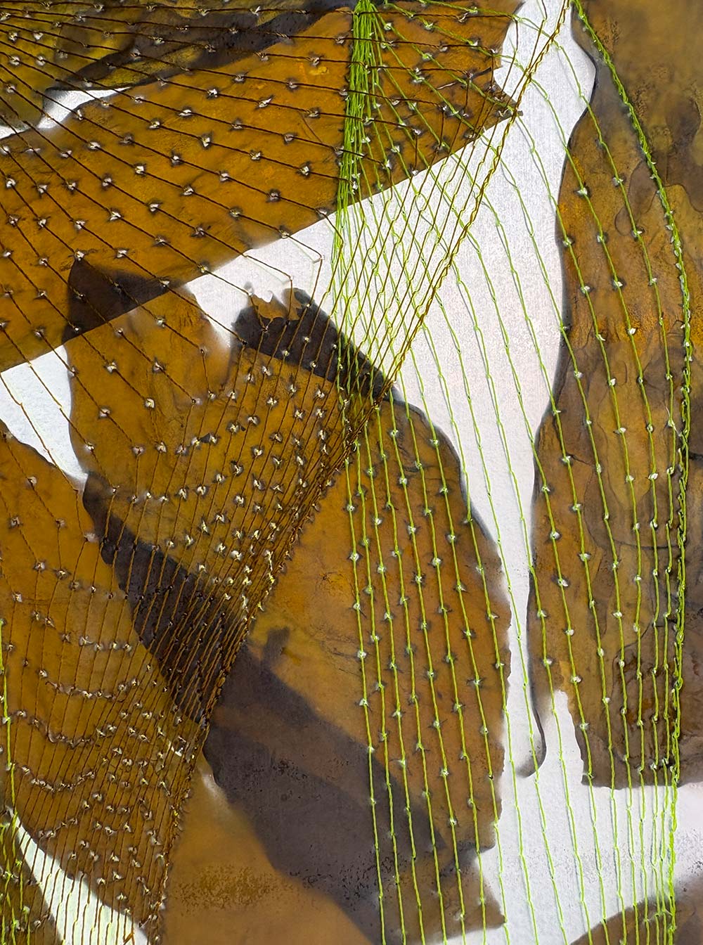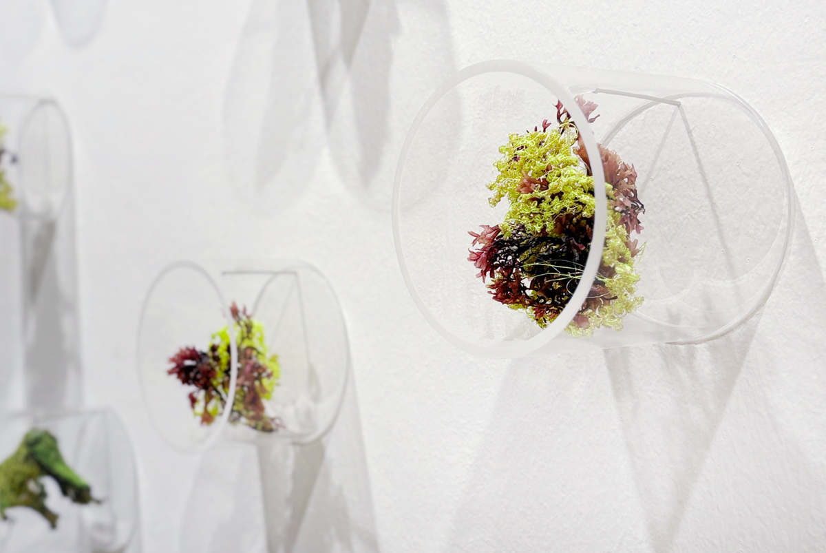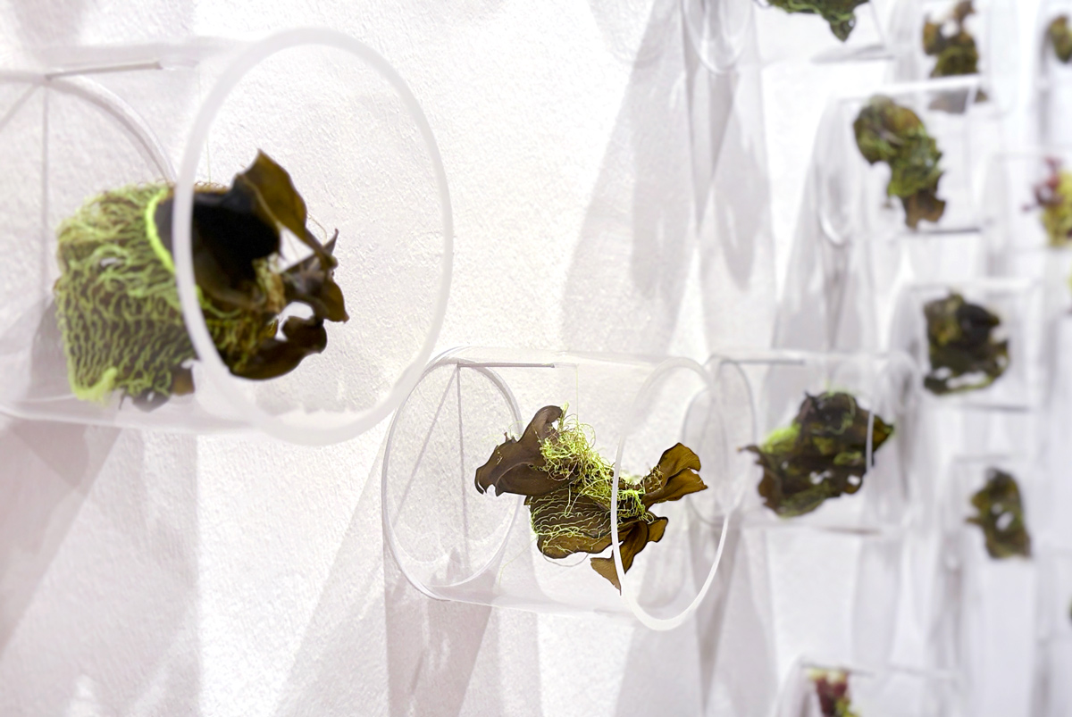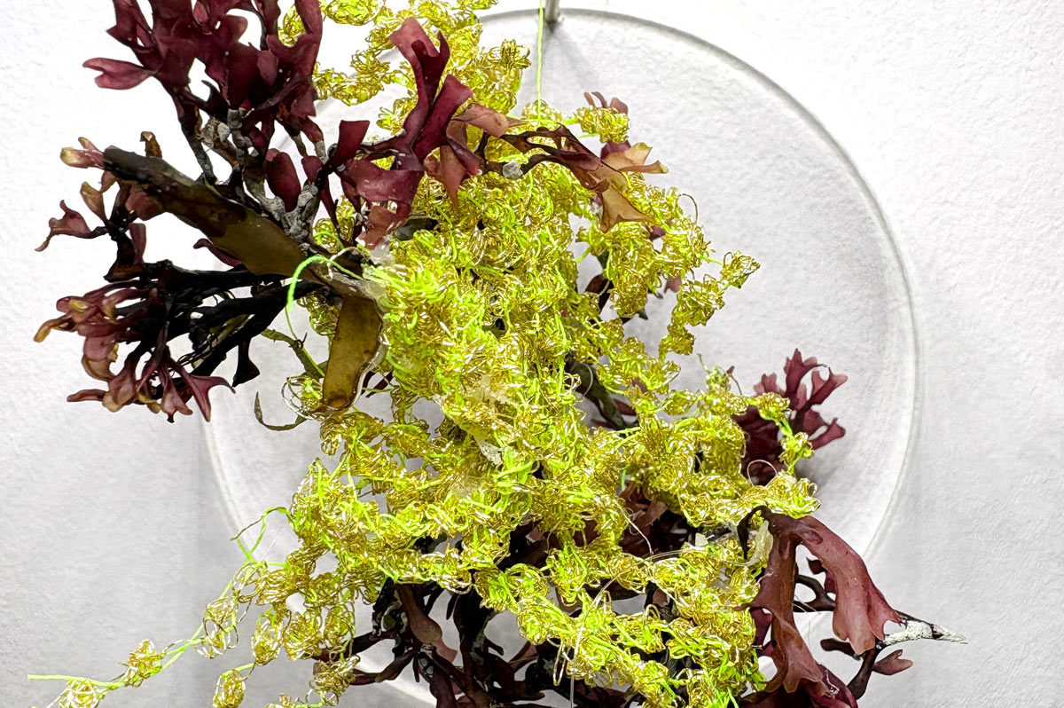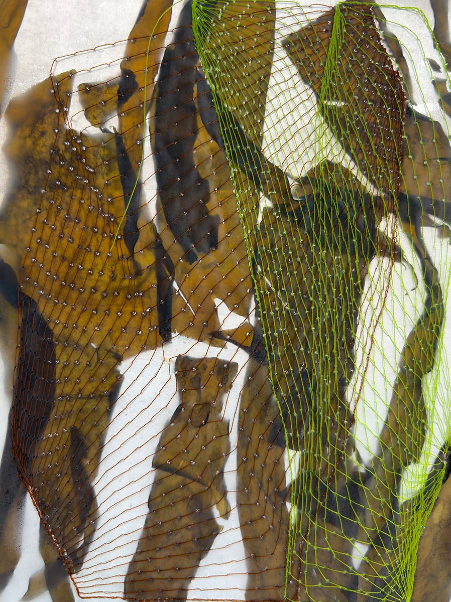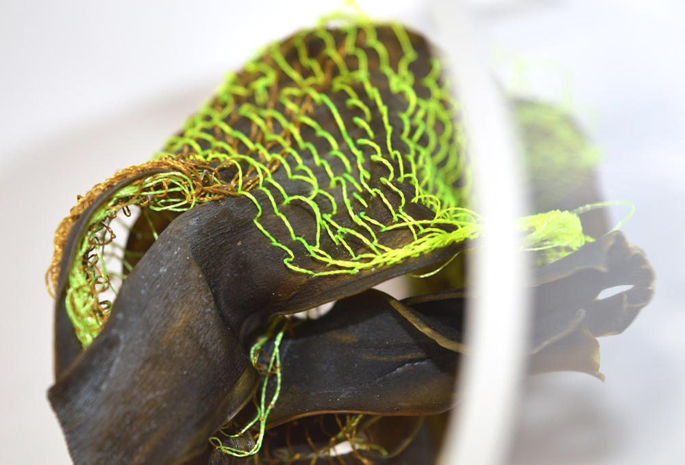 At the same time, the Iberian Peninsula is facing an invasion of algae from Asia, introduced via commercial shipping routes, which threatens the survival of native aquatic flora. In this work, kombu symbolises these invasive species, in contrast to the red algae of the Mediterranean Sea. Both have been intervened with fluorescent yellow threads, taking on irregular and ambiguous forms. The work oscillates between the familiar and the foreign, the fictional and the real, the natural and the synthetic.