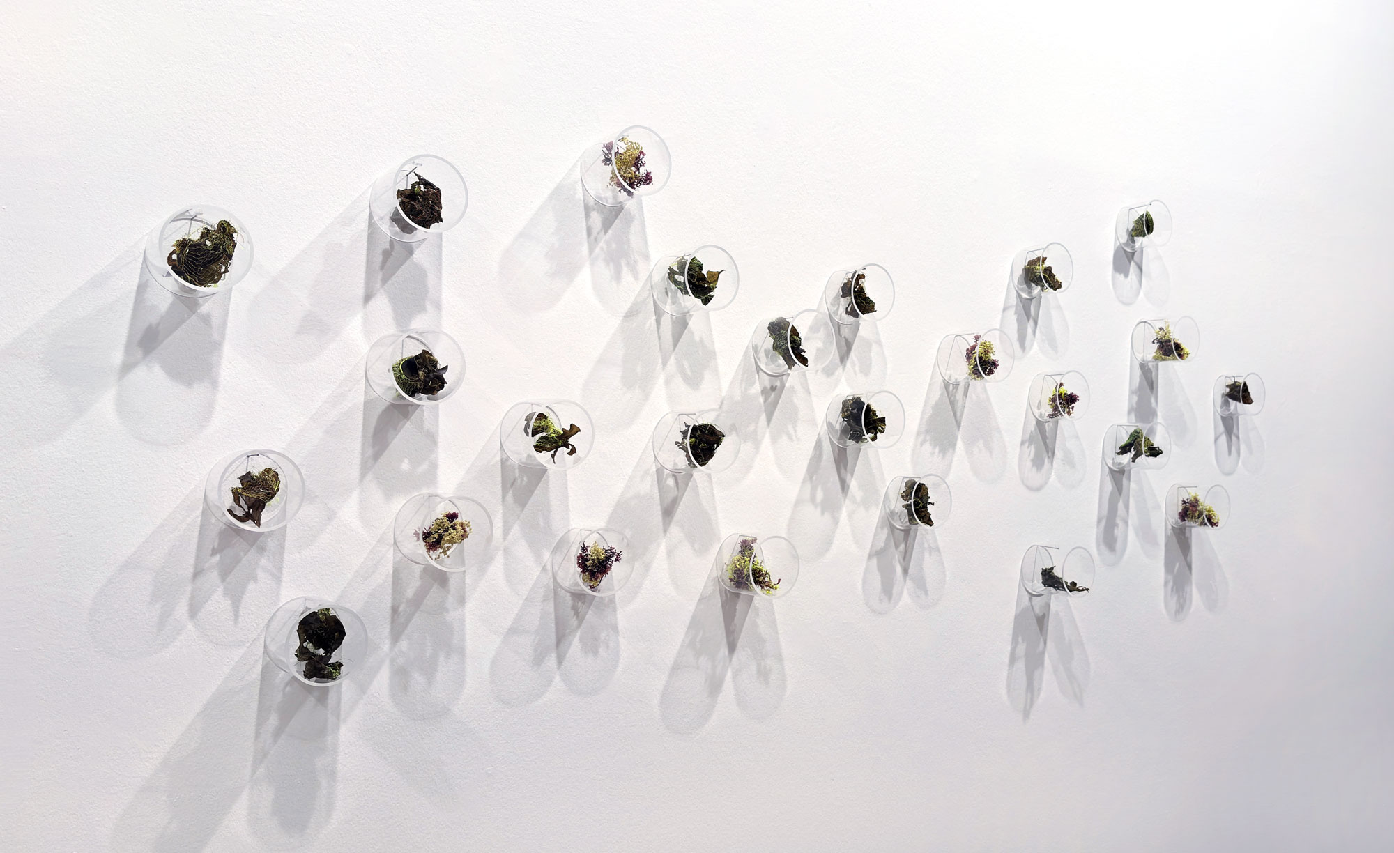 The series consists of 25 plexiglass tubes, each with a diameter of 10 cm and a depth of between 5 and 10 cm evoking the idea of scientific study objects, as found in the cabinets of natural history museums.