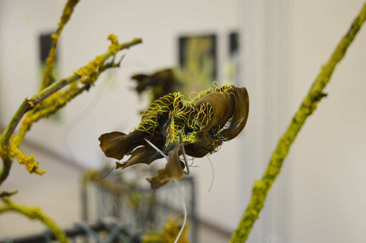 Detail Little Cosmic Garden, 2024 | acrylic on lichens, recycled cardboard, machine embroidery, branches with lichens, steel stele, knitted cords