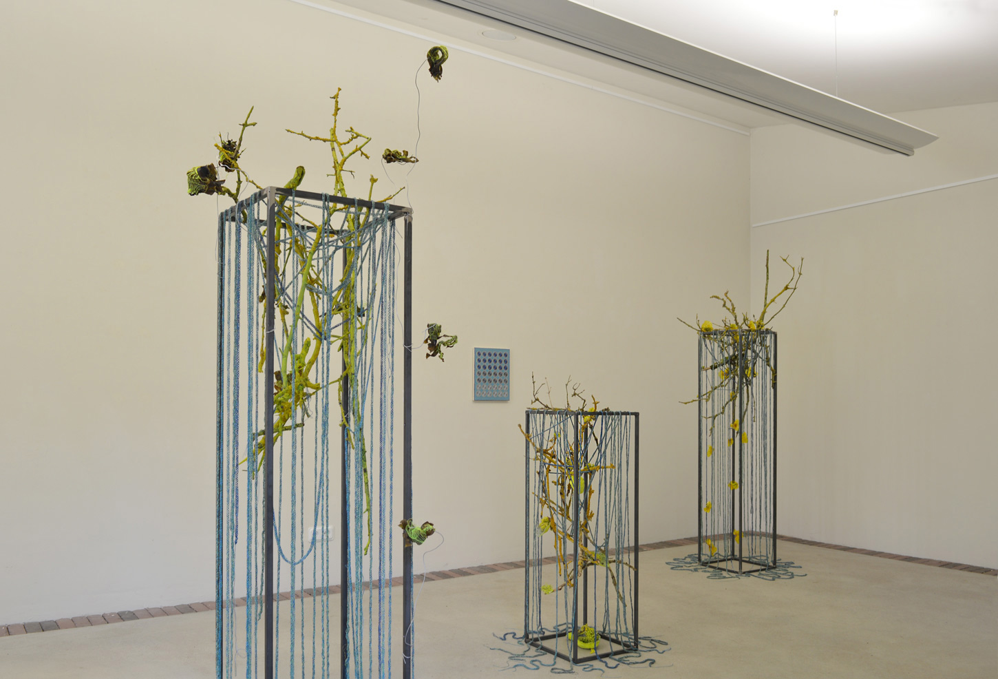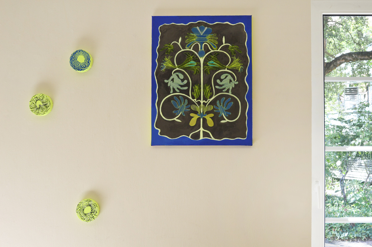 In her latest installation at Brühler Kunstverein, Alexandra Knie explores this imagination using textile and natural structures such as branches, lichens, and algae. In doing so, she creates a speculative ecosystem of „cosmic plants,“ exploring symbiotic relationships between the natural and the artificial, the scientific and the artistic, as well as the real and the fictional. She also translates this theme into acrylic and needle painting (machine embroidery) on both canvas and traditional Valencian fabrics, in medium and small-scale formats.