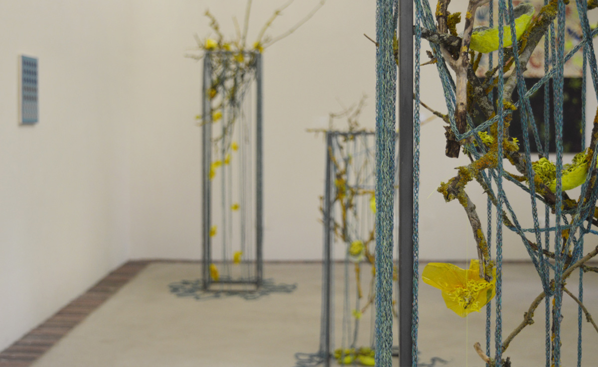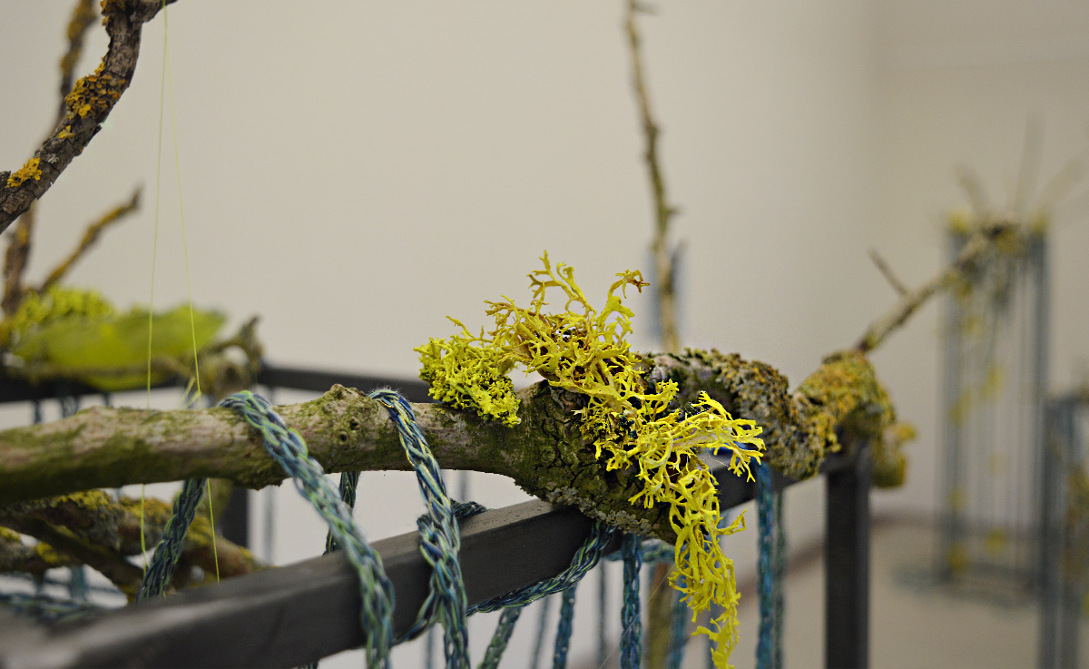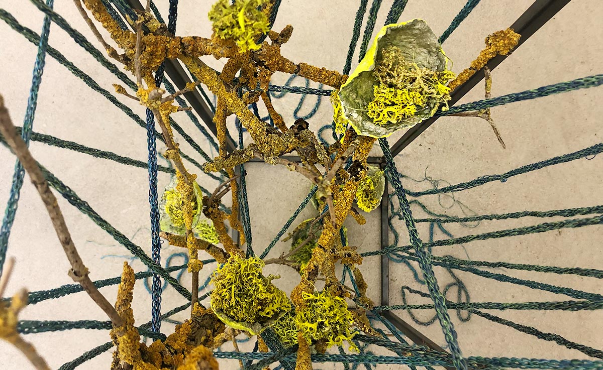 Detail Little Cosmic Garden, 2024 | acrylic on lichens, PVC, branches with lichens, steel stele, knitted cords