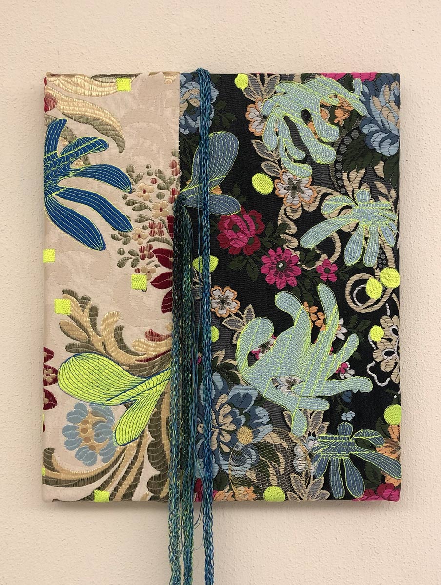 Ancient Space Plants II, 2024 | acrylic on canvas, tape, machine embroidery on synthetic fabric mounted on Espolín (traditional Valencian fabric); 165 x 120 cm