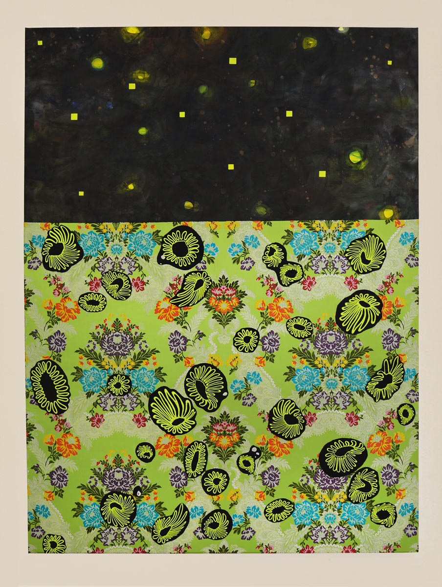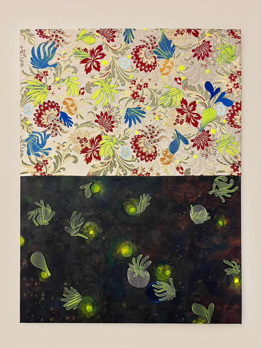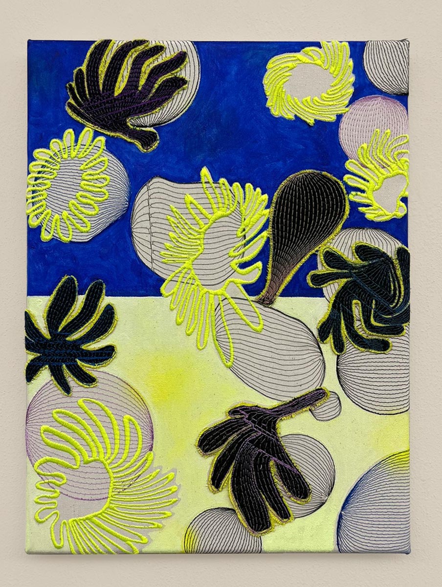 From Cosmic Garden, 2024 | acrylic and machine embroidery on raw canvas; 65 x 50 cm
