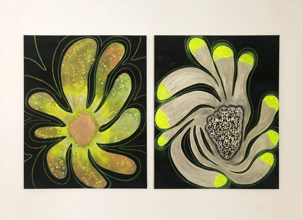 Model of a Giant Space Plant I+II, 2024 | acrylic, oil pastel and machine embroidery on raw cotton; 100 x 80 cm each one