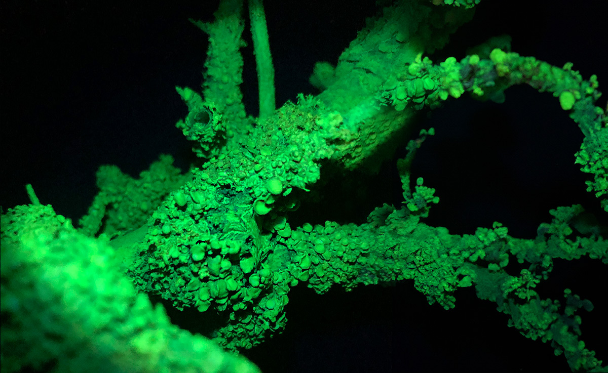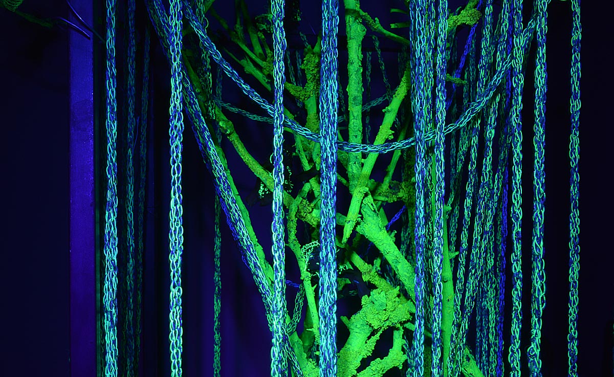 Detail Little Cosmic Garden, 2024 | acrylic on branches with lichens, black light