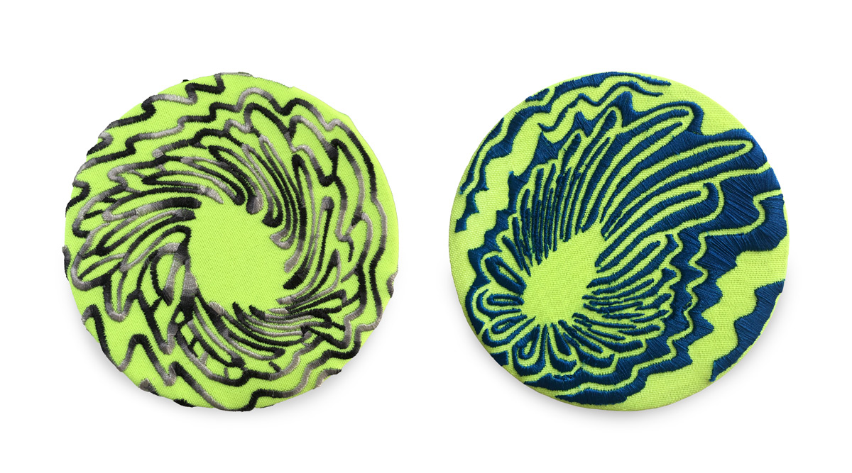 Spiral Space Flowers II, 2024 | machine embroidery on synthetic fabric; Ø 11 x 3 cm