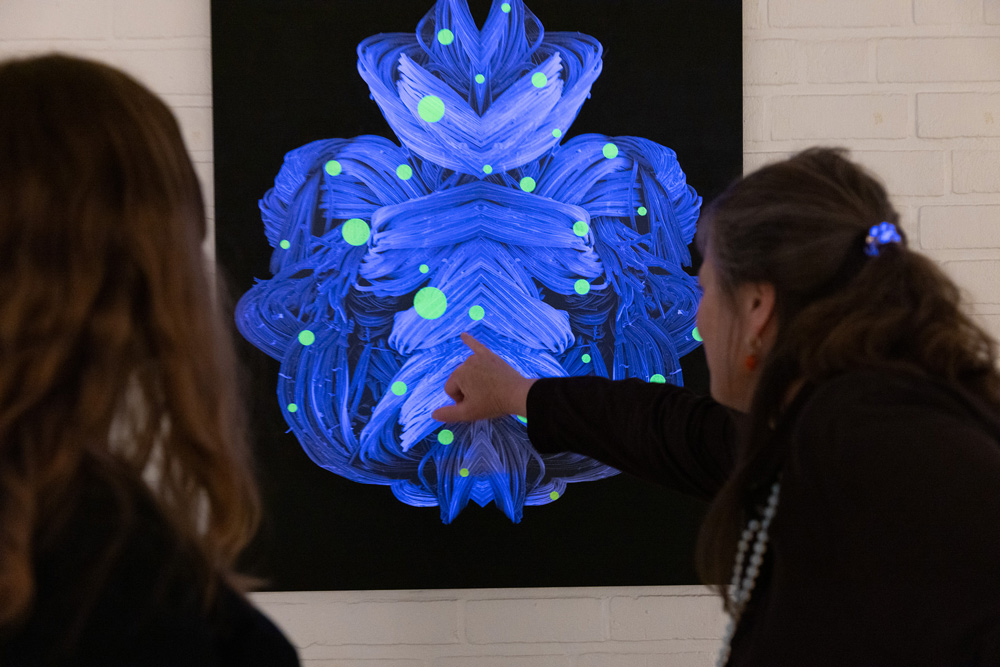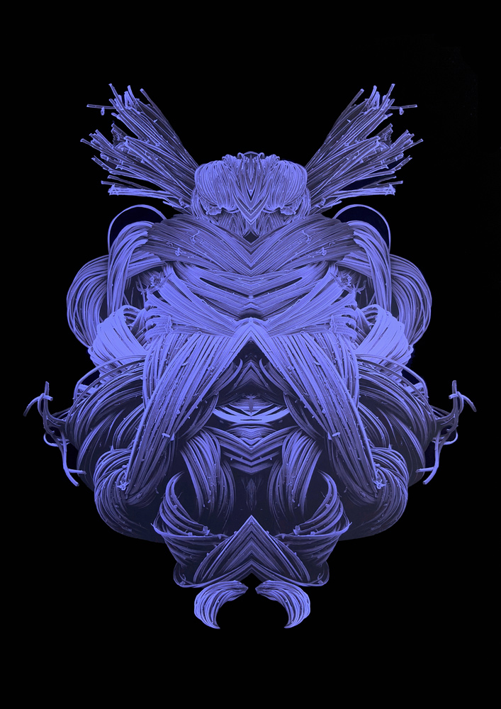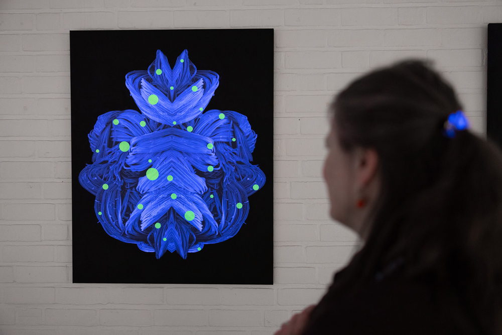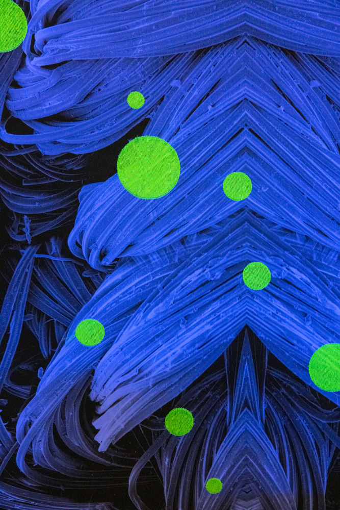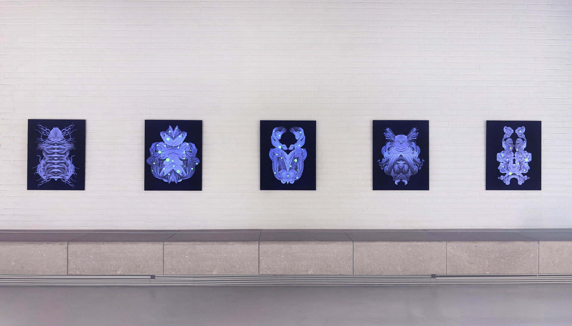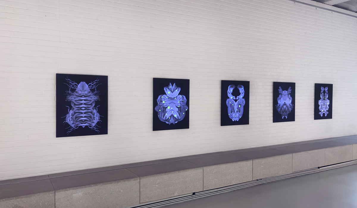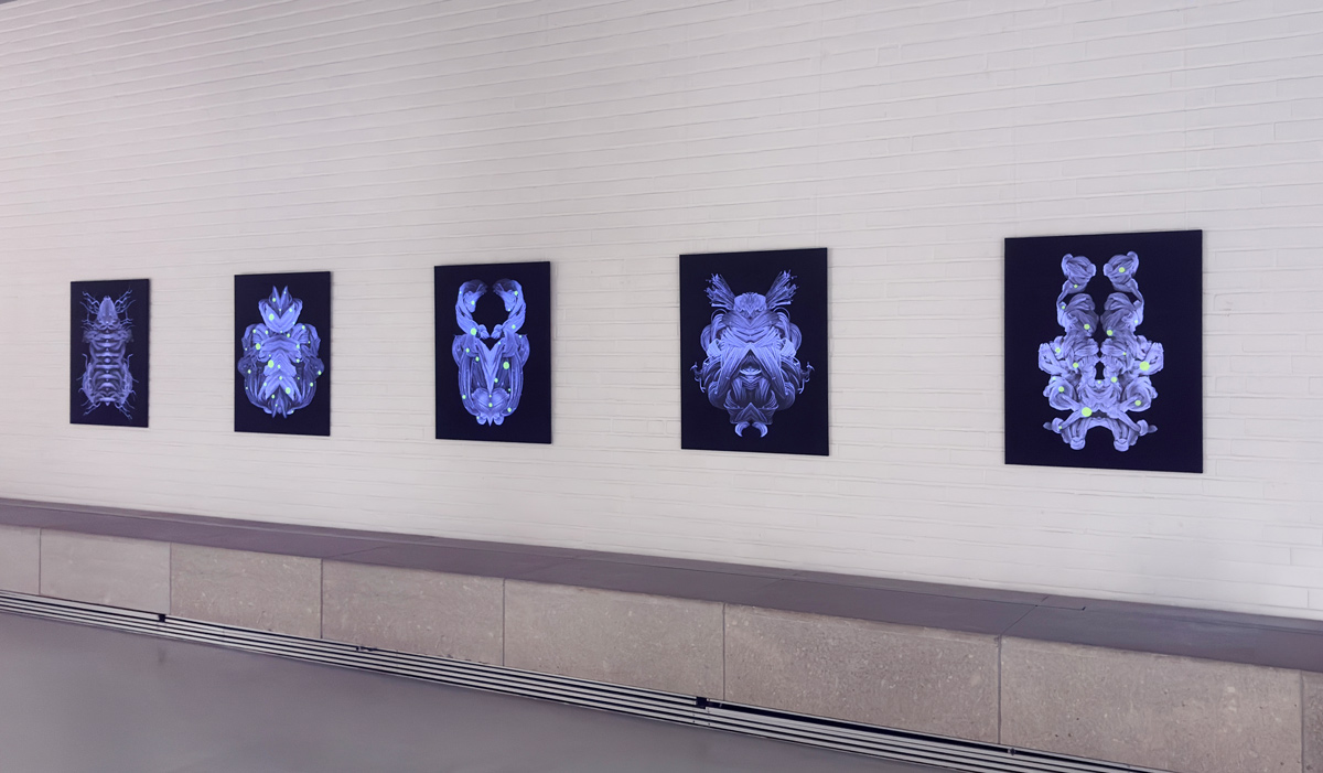 Through the use of black light in the exhibition space, the neon-yellow colouring of the embroidery thread, as well as the unprinted white areas of the digital prints of the individual Unknown Creatures, are activated. This interaction with light creates an additional, almost mystical dimension to the work and conceptually evokes bioluminescence — the chemical process by which certain organisms, such as fireflies (Lampyridae), produce light independently. The artificially induced luminosity reinforces the impression of a living system and expands the tension between natural appearance and artistic staging.