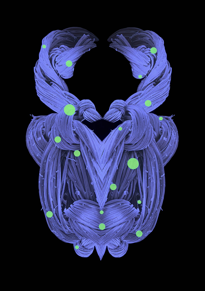 At first glance, the bodies of the Unknown Creatures series appear organic and alive. A look closer, however, this perception proves deceptive. What seems like biological fibres or filament-like muscle tissue is in fact inanimate matter. The works are based on small embroidery samples made from polyester thread, which, in collaboration with the botanist Dr. Julius Jeiter, were magnified up to 600 times using a scanning electron microscope (SEM). The resulting visual worlds originate from a scientific method of analysis, yet here they are removed from their original context, with artistic intent assuming the role of an ostensibly scientific form of evidence.