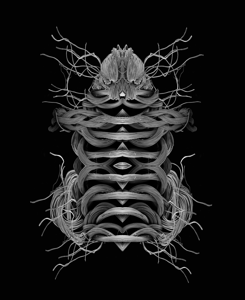 Each unknown creature is composed of fragments from original SEM images. Through repetition, superimposition and mirroring of the microscopic structures, insect-like beings emerge that cannot be assigned to any known species. The works oscillate between scientific imaging and artistic construction, creating the impression of novel organisms that seemingly call for taxonomic investigation.